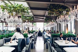 If you want to fully embrace Meatpacking, go to RH Rooftop, an American spot on the roof of Restoration Hardware. Take the all-glass elevator up past the five floors of marble statues, fountains, and beds that costs as much as barely used SUVs. Eventually, you’ll reach the walk-in-only restaurant, with its own fountains and trees, and a chandelier over every table. If you sit down for lunch or dinner, then order the creamy burrata and the shaved ribeye sandwich on a garlic bread baguette. You could also just have some drinks on the huge outdoor terrace, which has nice views of the downtown skyline and other rooftop bars in the neighborhood.